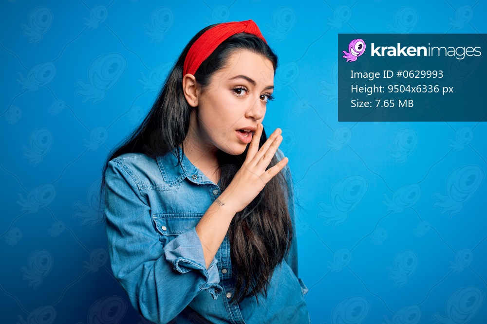 Young brunette woman wearing casual denim shirt over blue isolated background hand on mouth telling secret rumor, whispering malicious talk conversation - Kraken Images