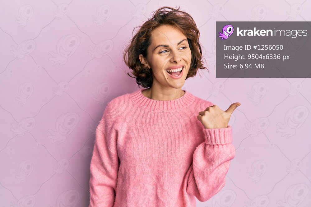 Young brunette woman wearing casual winter sweater pointing thumb up to the side smiling happy with open mouth