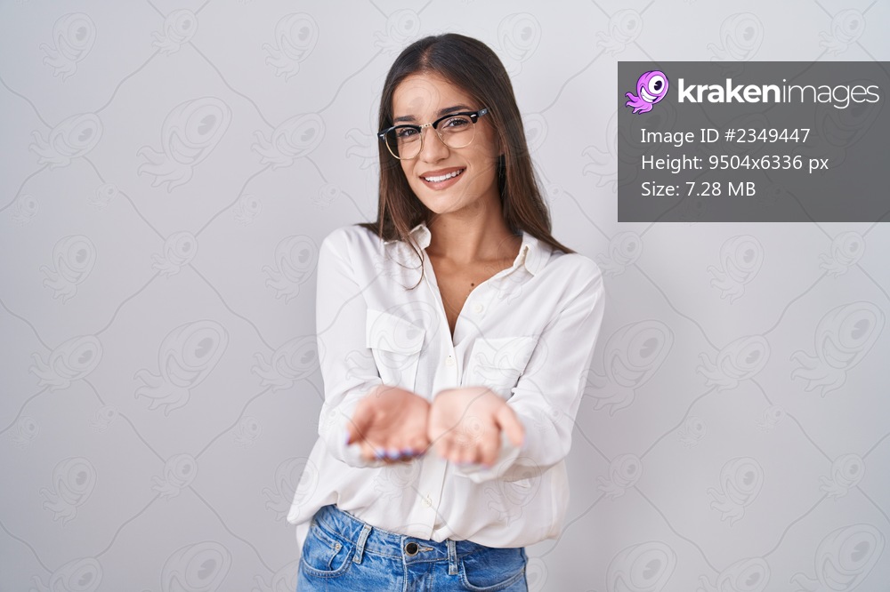 Young brunette woman wearing glasses smiling with hands palms together receiving or giving gesture. hold and protection