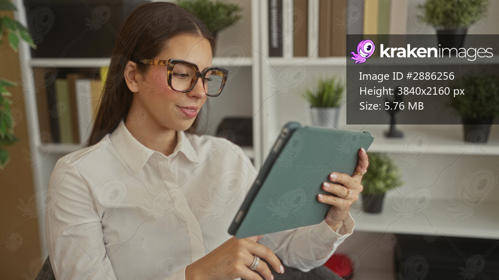 Young brunette woman wearing glasses and white shirt holds tablet and pumps fist in office building; success celebration joy.