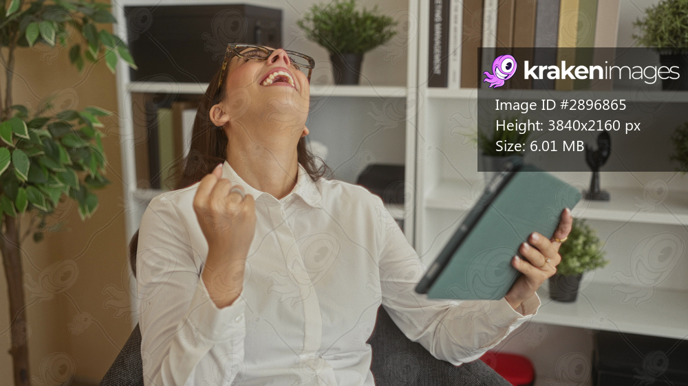 Young brunette woman wearing glasses and white shirt holds tablet and pumps fist in office building; success celebration joy.