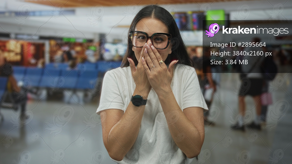 Young brunette woman wearing oversized glasses covers mouth with both hands while laughing in busy airport terminal; joyful surprise travel.