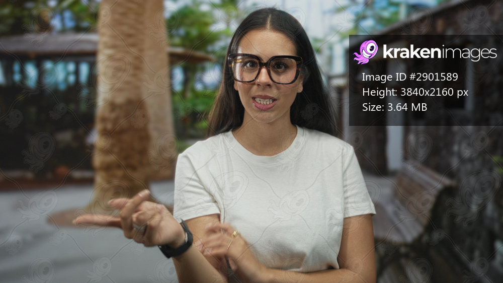 Young brunette woman wearing oversized glasses and finger pointing while smiling at camera on a tree lined street with bench; playful banter.