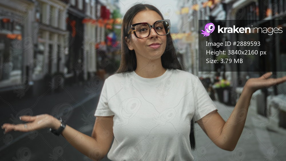 Young brunette woman wearing oversized tortoiseshell glasses and white t shirt hands raised palms up shrugging on a street; casual confusion.