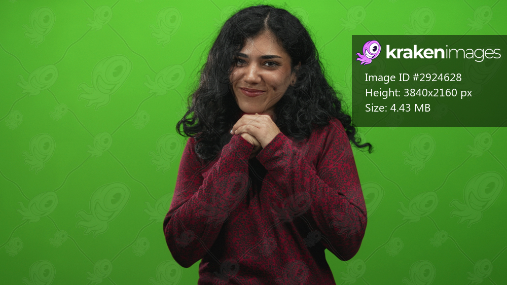 Young brunette woman wearing red sweater with hands over chest smiling in green studio; warm gratitude.