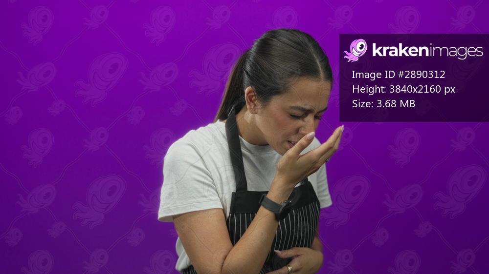 Young brunette woman wearing striped apron covers mouth with hand, eyes closed and holding stomach in purple studio; disgust reaction.