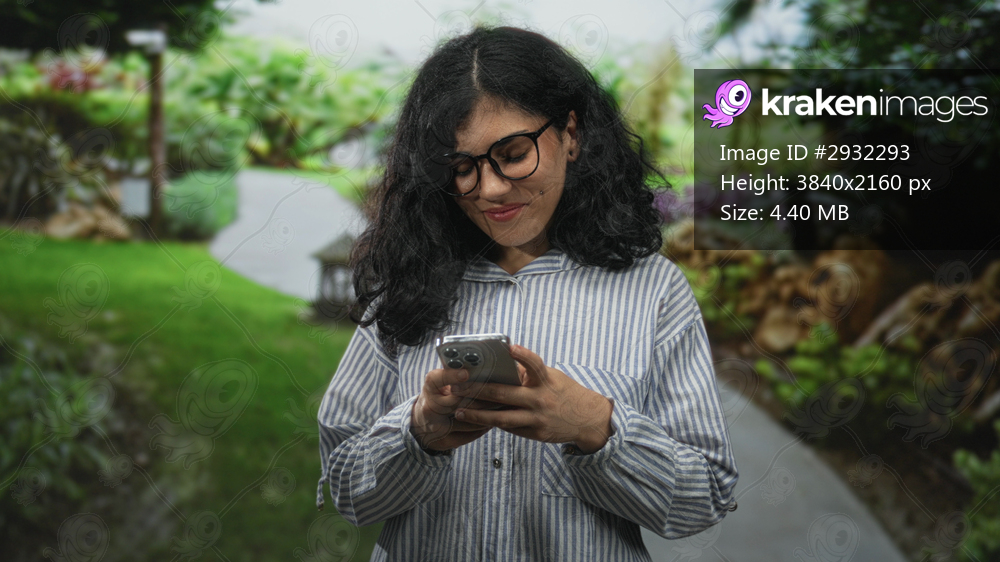 Young brunette woman wearing striped shirt texting on smartphone while standing on a forest path near green lawn and trees; calm concentration.