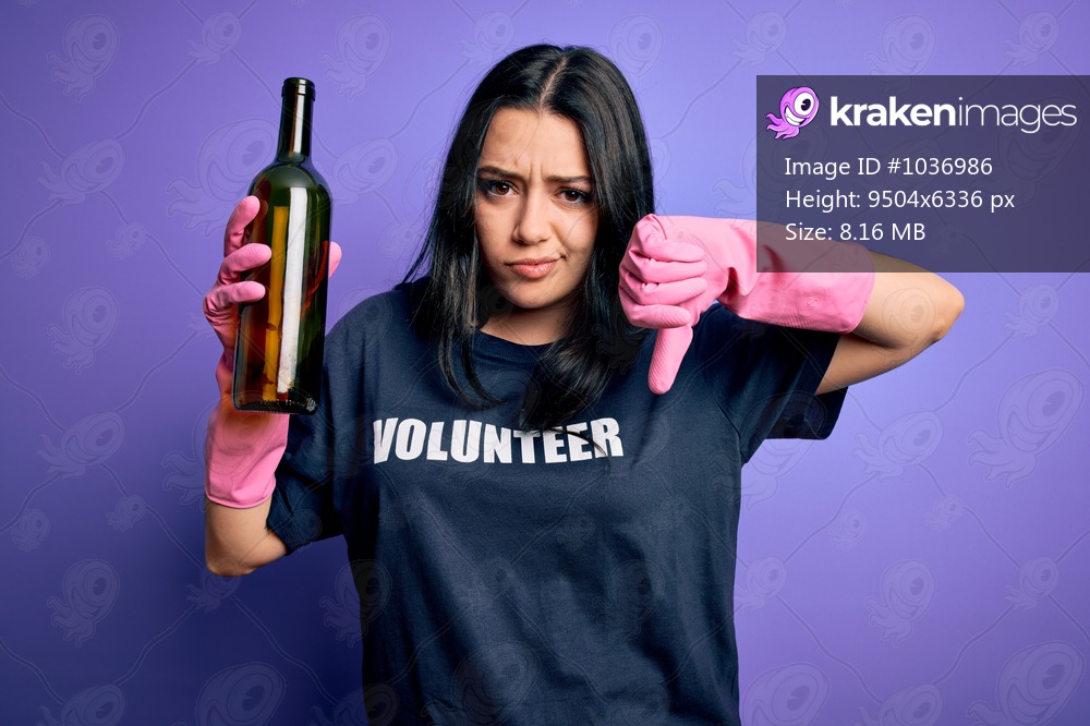 Young brunette woman wearing volunteer t-shirt picking glass bottle over purple background with angry face, negative sign showing dislike with thumbs down, rejection concept