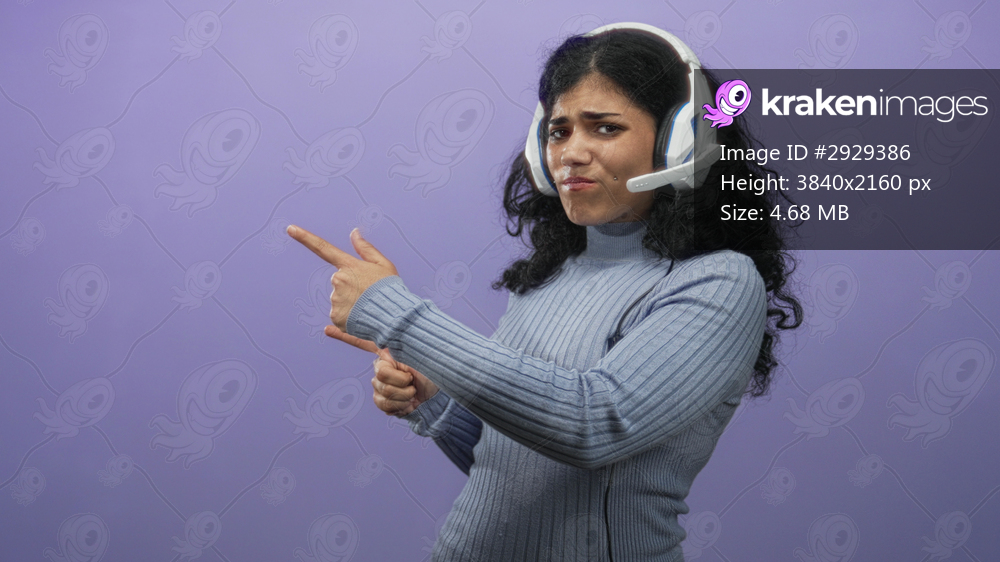 Young brunette woman wearing white gaming headset pointing finger to the left at camera in a purple studio; frustration gameplay.