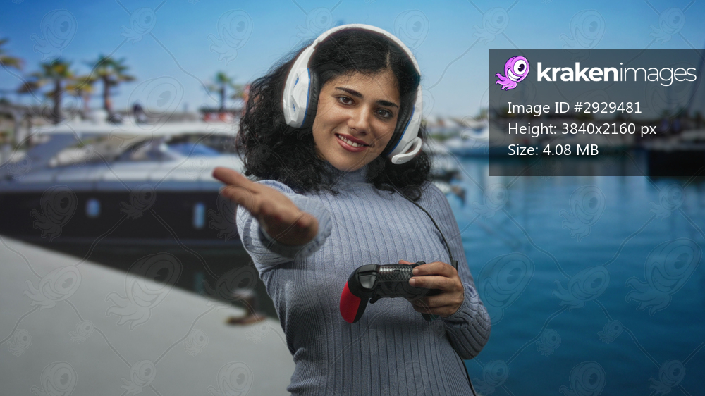 Young brunette woman wearing white headset holding black and red controller, smiling and gesturing with her hands on street beside boats and marina; relaxed casual play. - Kraken Images