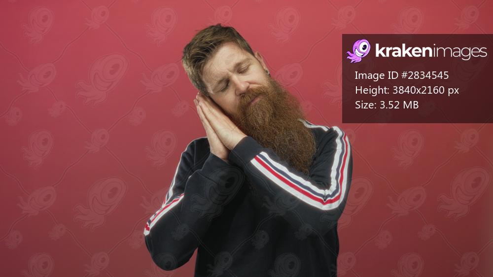 Young caucasian bearded man with closed eyes pressing palms to cheek in red studio setting; calm rest.