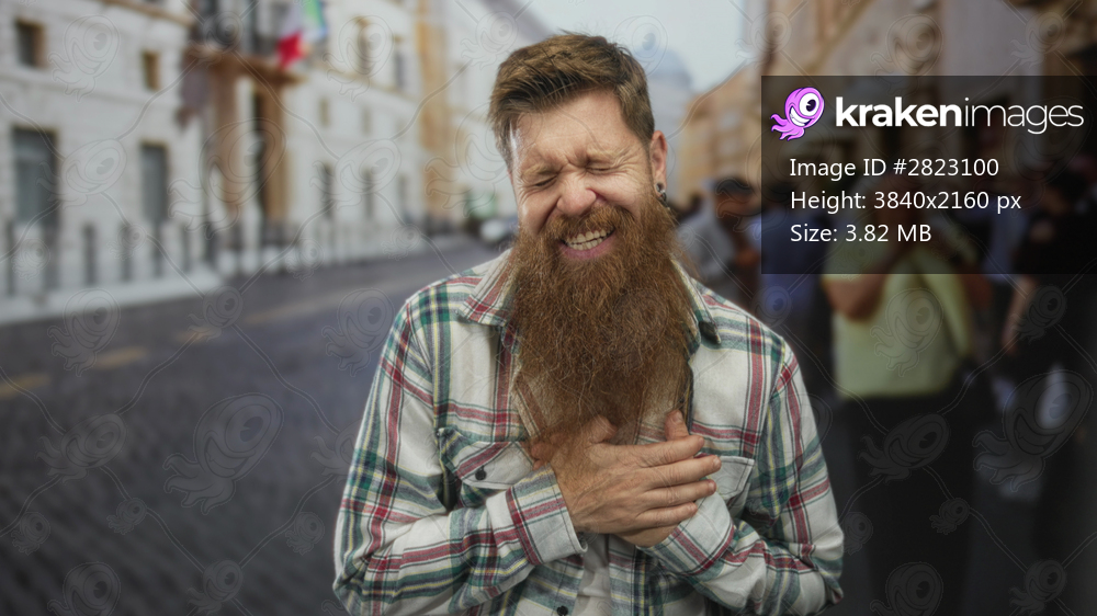 Young caucasian bearded man clutch chest heartattack on urban street amid blurred pedestrians under sunlight; distress.