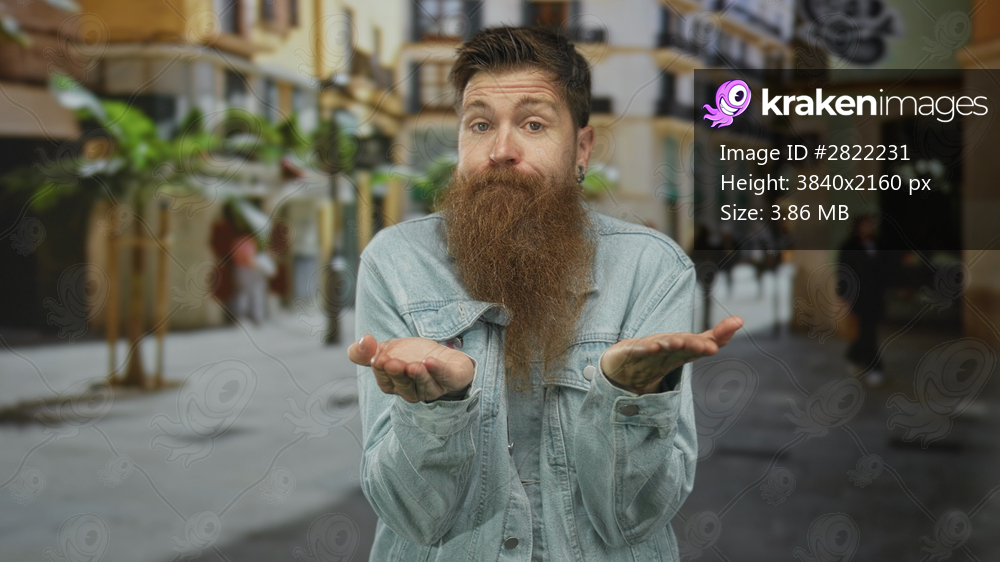 Young caucasian bearded man wearing casual denim jacket holds open palms up gesture on city street; uncertainty.