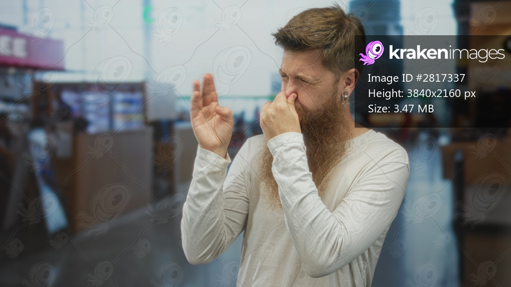 Young caucasian bearded man wearing white shirt pinches nose in modern busy airport terminal hall; disgust revulsion nausea aversion.