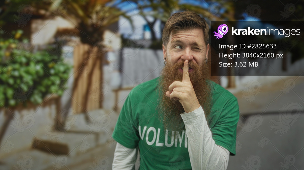 Young caucasian bearded volunteer man wearing green shirt finger to lips for silence on sunny street; secrecy.