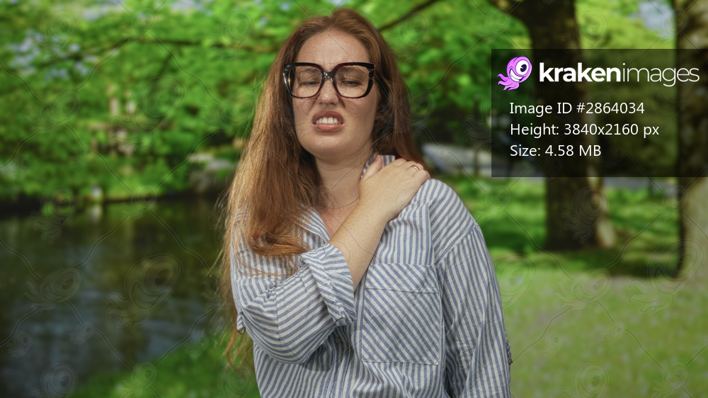 Young caucasian bespectacled woman in striped shirt holds her sore shoulder beside tree in grassy forest clearing; physical discomfort.