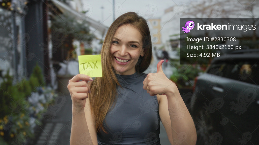 Young caucasian brunette woman holding bright yellow tax note and giving thumbs-up on urban street; financial optimism.