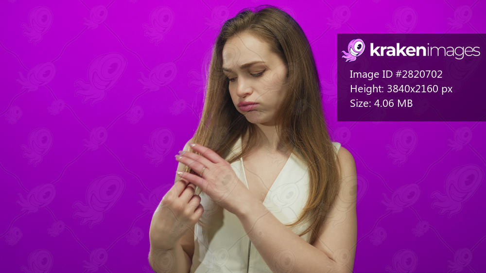 Young caucasian brunette woman touching hair in purple studio under bright lights wearing white top; confusion.