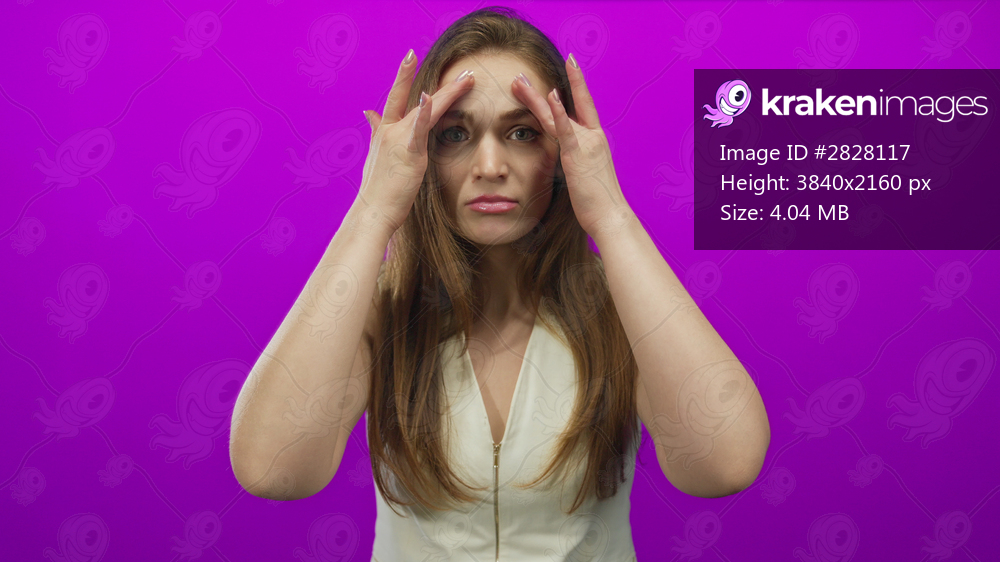Young caucasian brunette woman touching hair in purple studio under bright lights wearing white top; confusion.