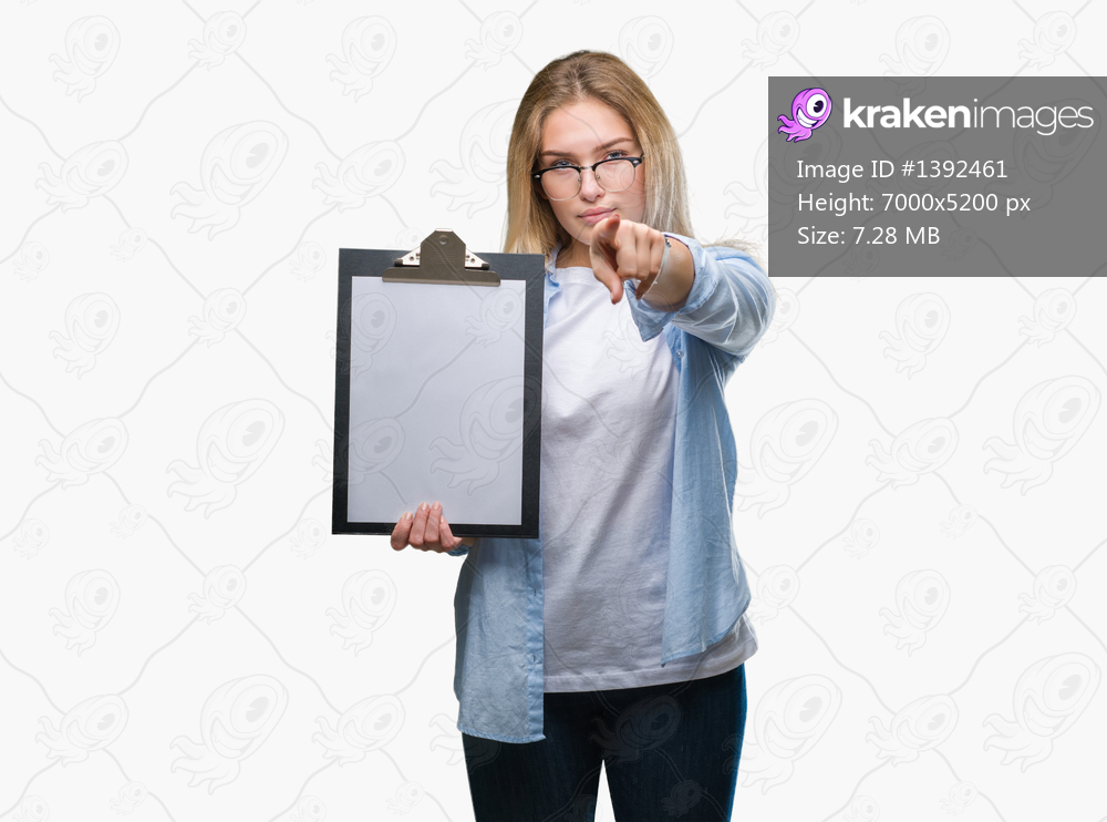 Young caucasian business woman holding clipboard over isolated background pointing with finger to the camera and to you, hand sign, positive and confident gesture from the front - Kraken Images