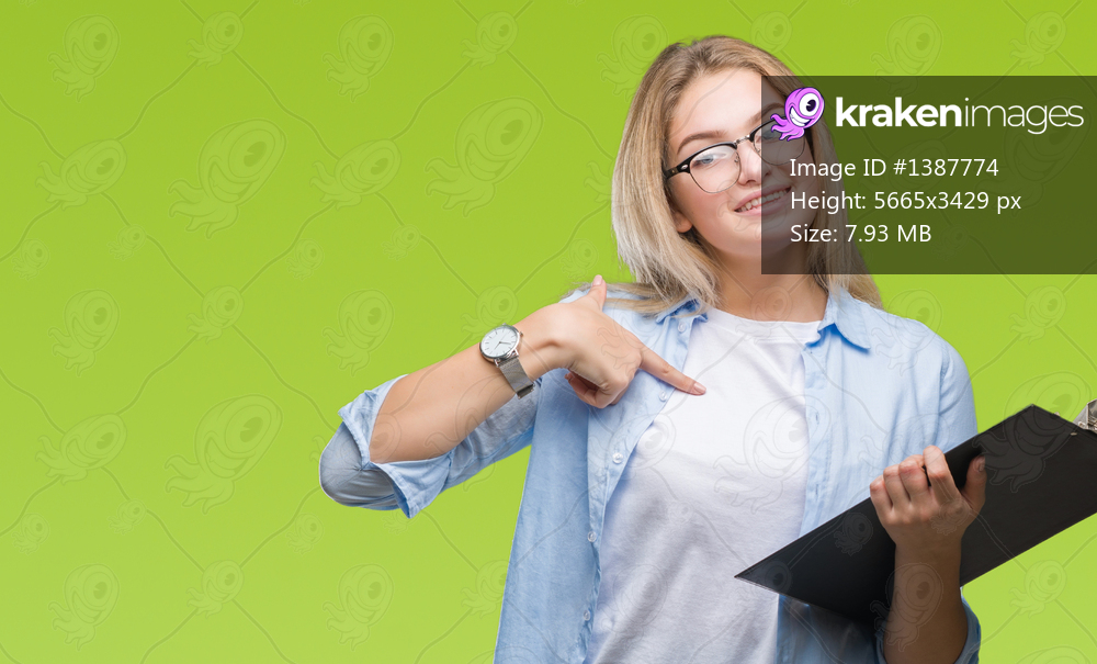 Young caucasian business woman holding clipboard over isolated background with surprise face pointing finger to himself