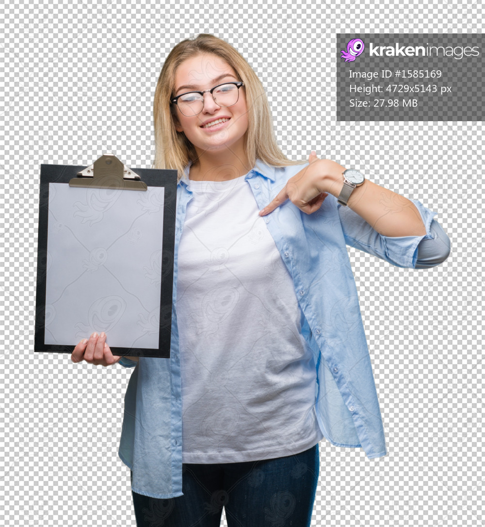 Young caucasian business woman holding clipboard over isolated background with surprise face pointing finger to himself