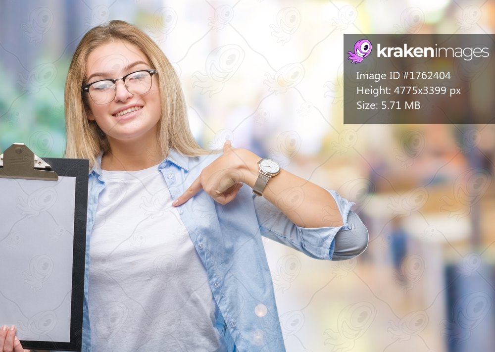 Young caucasian business woman holding clipboard over isolated background with surprise face pointing finger to himself
