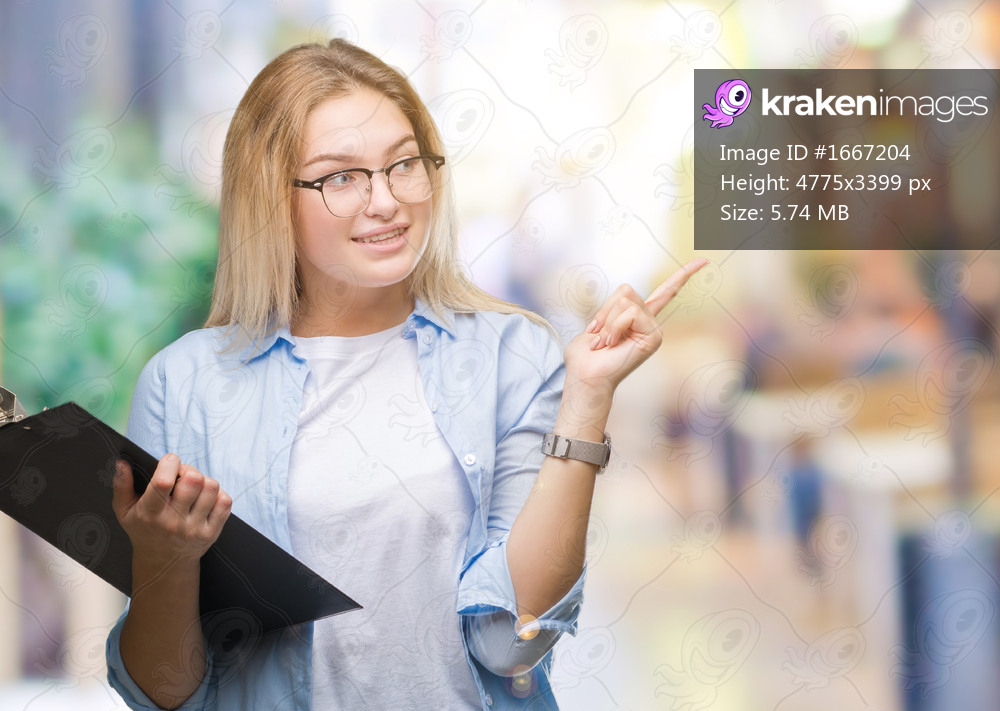 Young caucasian business woman holding clipboard over isolated background very happy pointing with hand and finger to the side