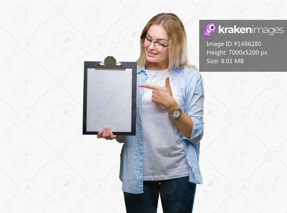 Young caucasian business woman holding clipboard over isolated background very happy pointing with hand and finger