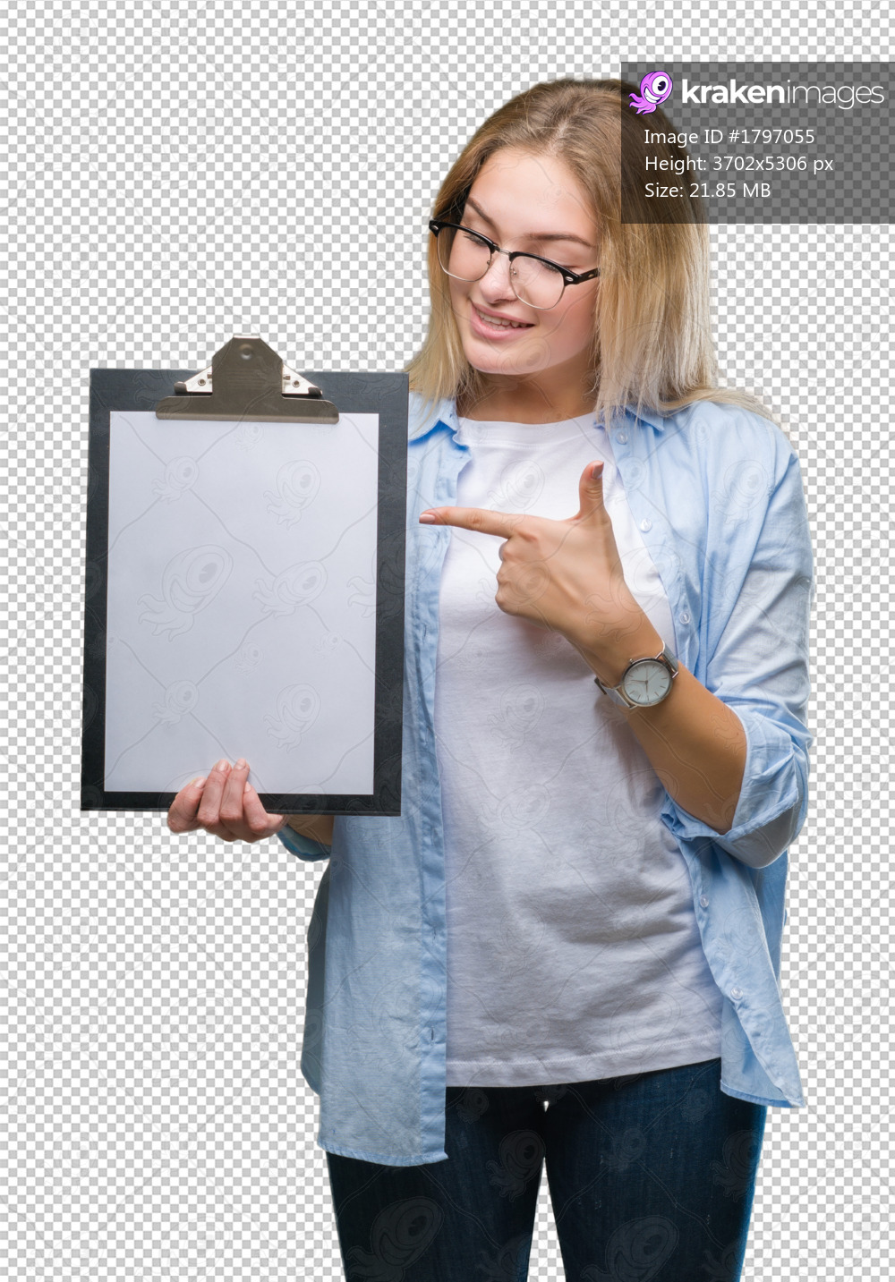 Young caucasian business woman holding clipboard over isolated background very happy pointing with hand and finger