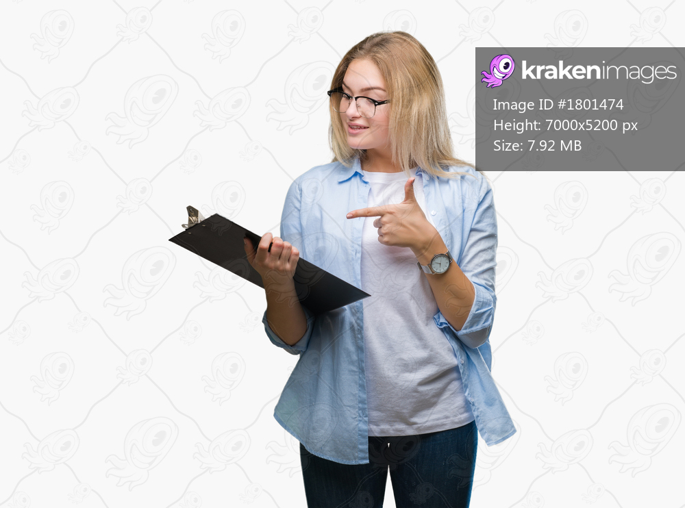 Young caucasian business woman holding clipboard over isolated background very happy pointing with hand and finger