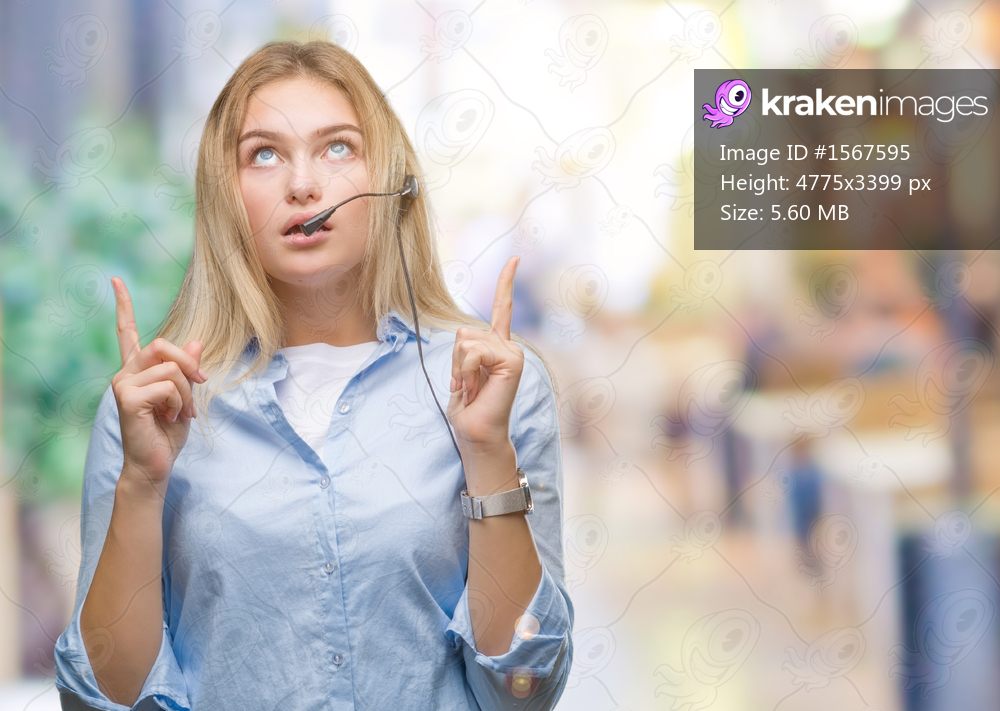 Young caucasian business woman wearing call center headset over isolated background amazed and surprised looking up and pointing with fingers and raised arms. - Kraken Images