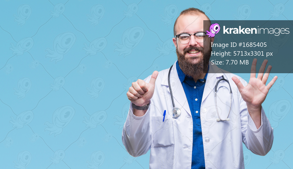 Young caucasian doctor man wearing medical white coat over isolated background showing and pointing up with fingers number six while smiling confident and happy. - Kraken Images
