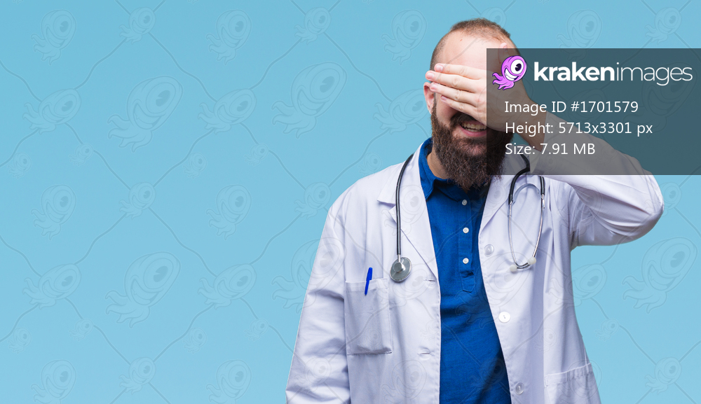 Young caucasian doctor man wearing medical white coat over isolated background smiling and laughing with hand on face covering eyes for surprise. Blind concept. - Kraken Images