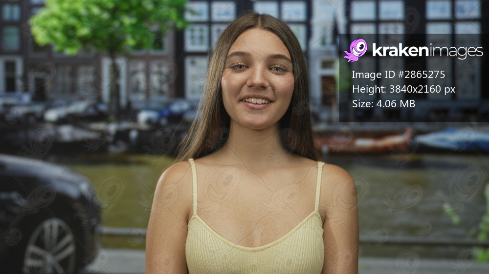 Young caucasian girl smiles by canal on street under bright midday sunlight; pure effortless joy moment.