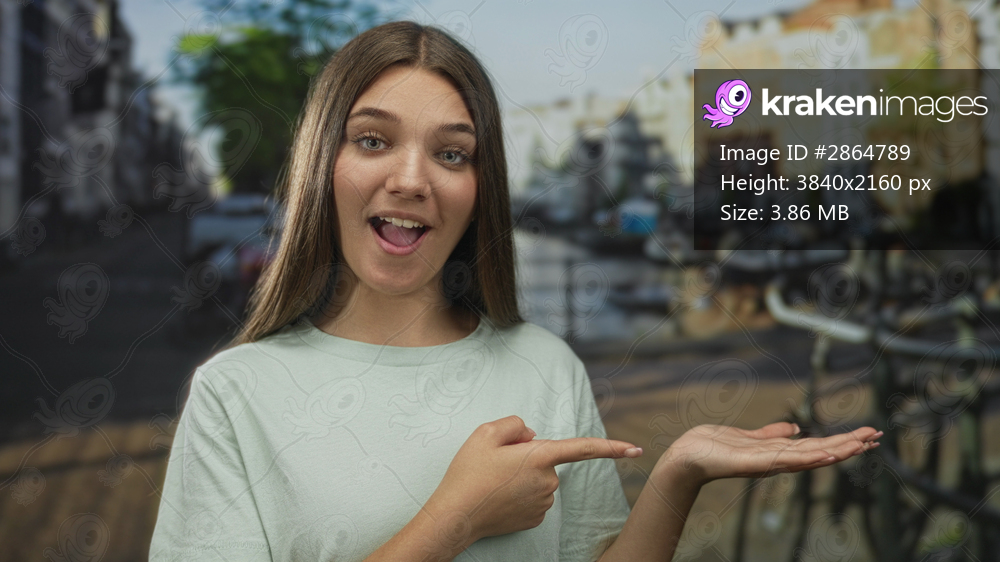 Young caucasian girl smiling holds open palm and points finger to it on sunny street; curiosity exploration wonder insight.