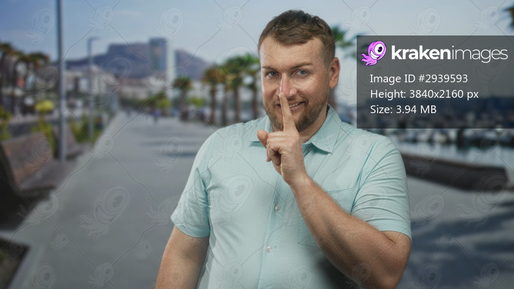 Young caucasian heavyset man with index finger to lips for silence on seaside street beside a marina and boats; secrecy calm.