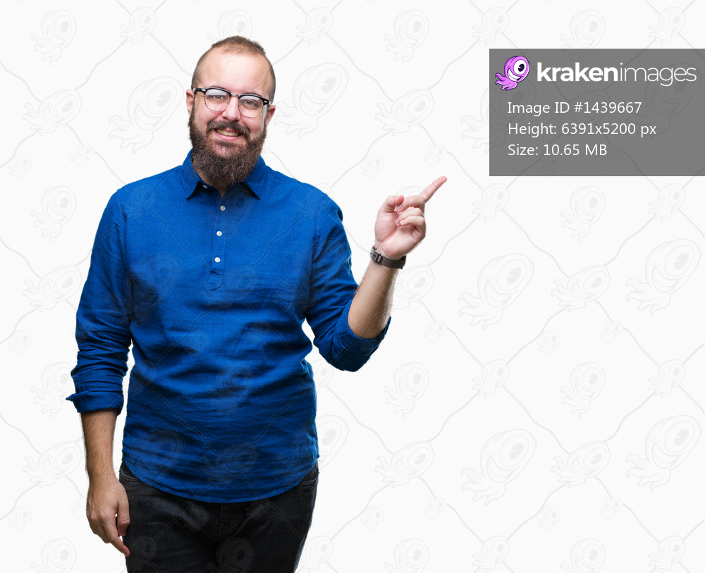 Young caucasian hipster man wearing glasses over isolated background with a big smile on face, pointing with hand and finger to the side looking at the camera. - Kraken Images