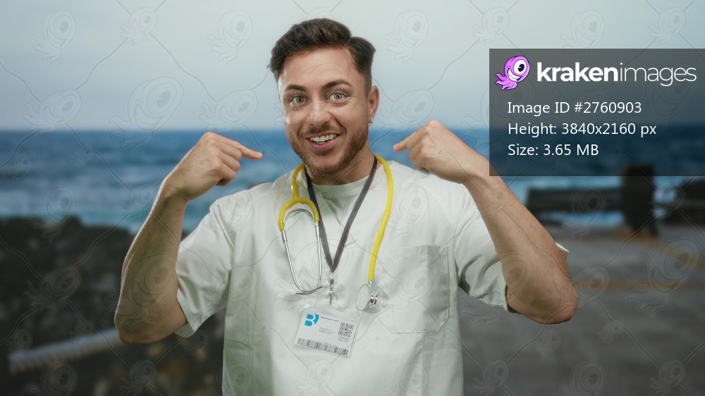 Young caucasian male doctor with beard and stethoscope smiling and pointing to himself on a seaside promenade with ocean in the background.