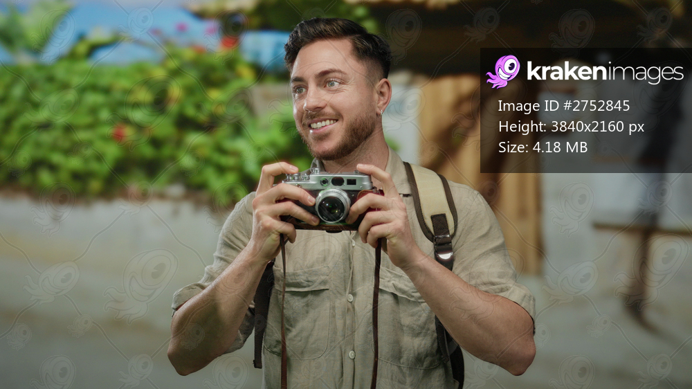 Young caucasian man with a beard holding a camera and wearing a backpack, enjoying his photography journey through a vibrant outdoor city street.