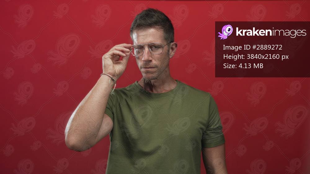 Young caucasian man adjusting clear glasses while raising his right hand in red studio; introspection thoughtful focus clarity.