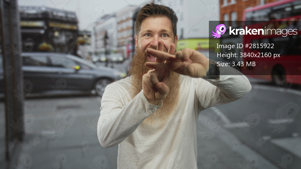 Young caucasian man with beard forms hashtag gesture with fingers on street while smiling broadly in daylight; playful joy.