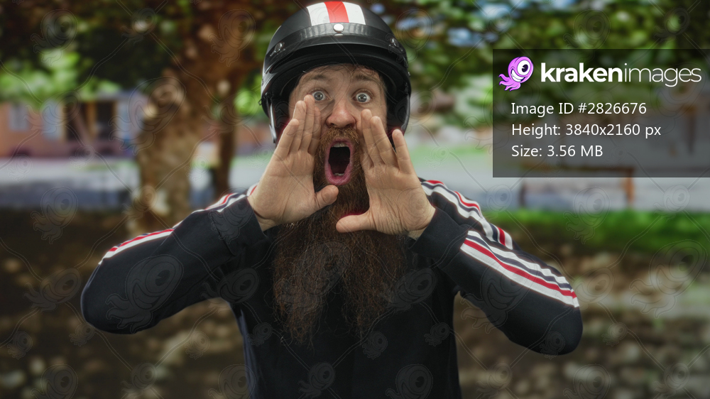 Young caucasian man with beard and helmet raising hands and shouting in sunny green park amid trees; urgency.