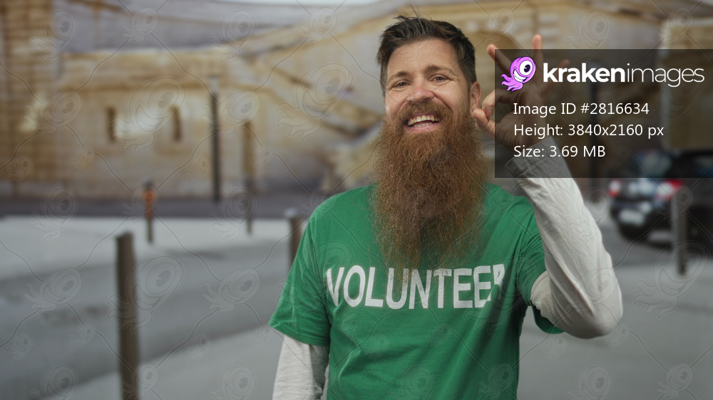 Young caucasian man with beard wearing volunteer shirt makes ok sign with hand in urban street; optimism.