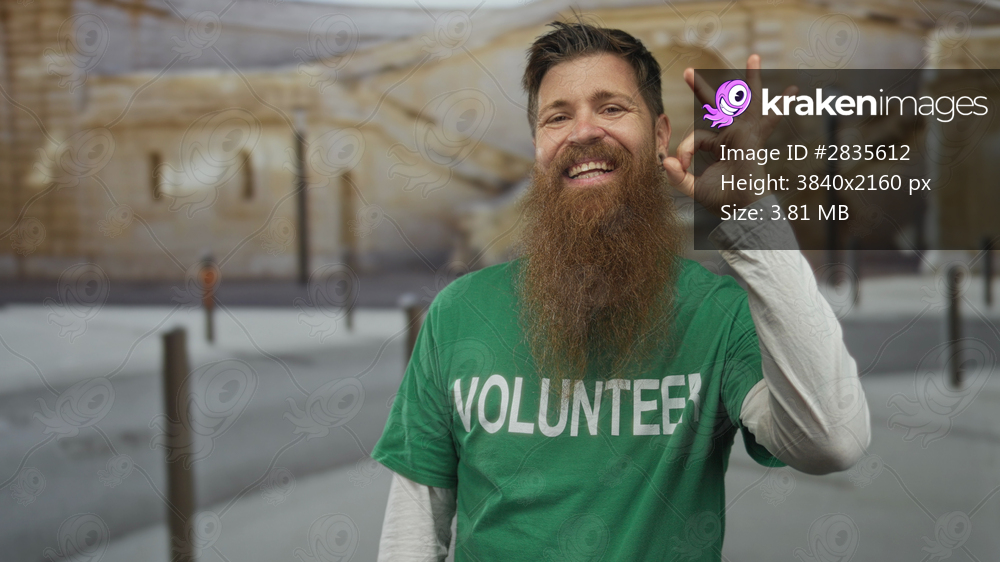 Young caucasian man with beard wearing volunteer shirt makes ok sign with hand in urban street; optimism.
