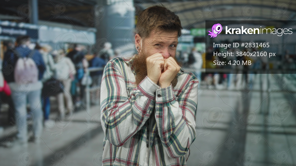 Young caucasian man covers mouth with fists while standing in crowded airport terminal check in queue; anxiety.