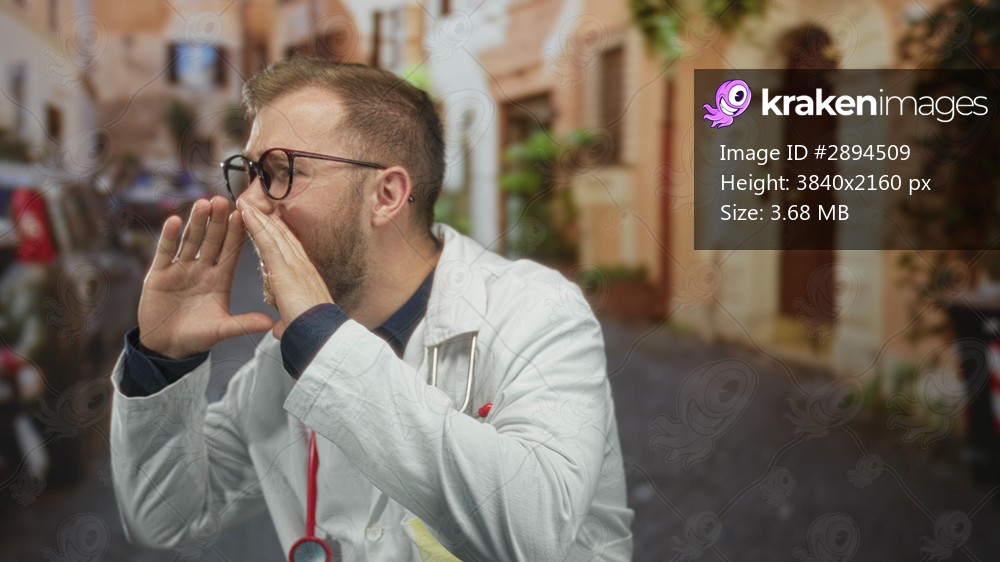 Young caucasian man doctor with stethoscope cups hands to shout on a cobblestone street beside parked scooters and buildings; public health alert.