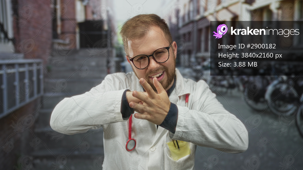 Young caucasian man doctor with stethoscope and labcoat wearing glasses crossing hands in street; defiance rejection.