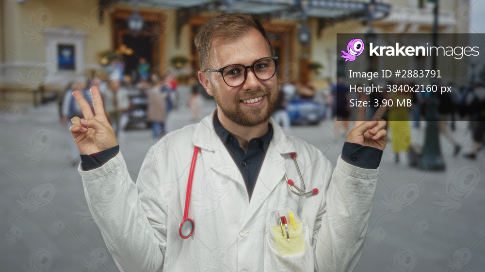 Young caucasian man doctor wearing white coat and red stethoscope with pens in pocket, glasses and stubble, smiling and flashing peace sign in street building; community health optimism. - Kraken Images