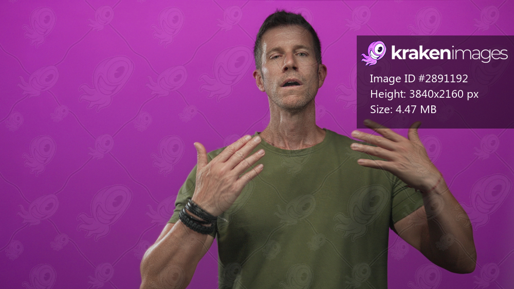 Young caucasian man gesturing with hands and bracelets, wearing green t shirt in purple studio; frustration.